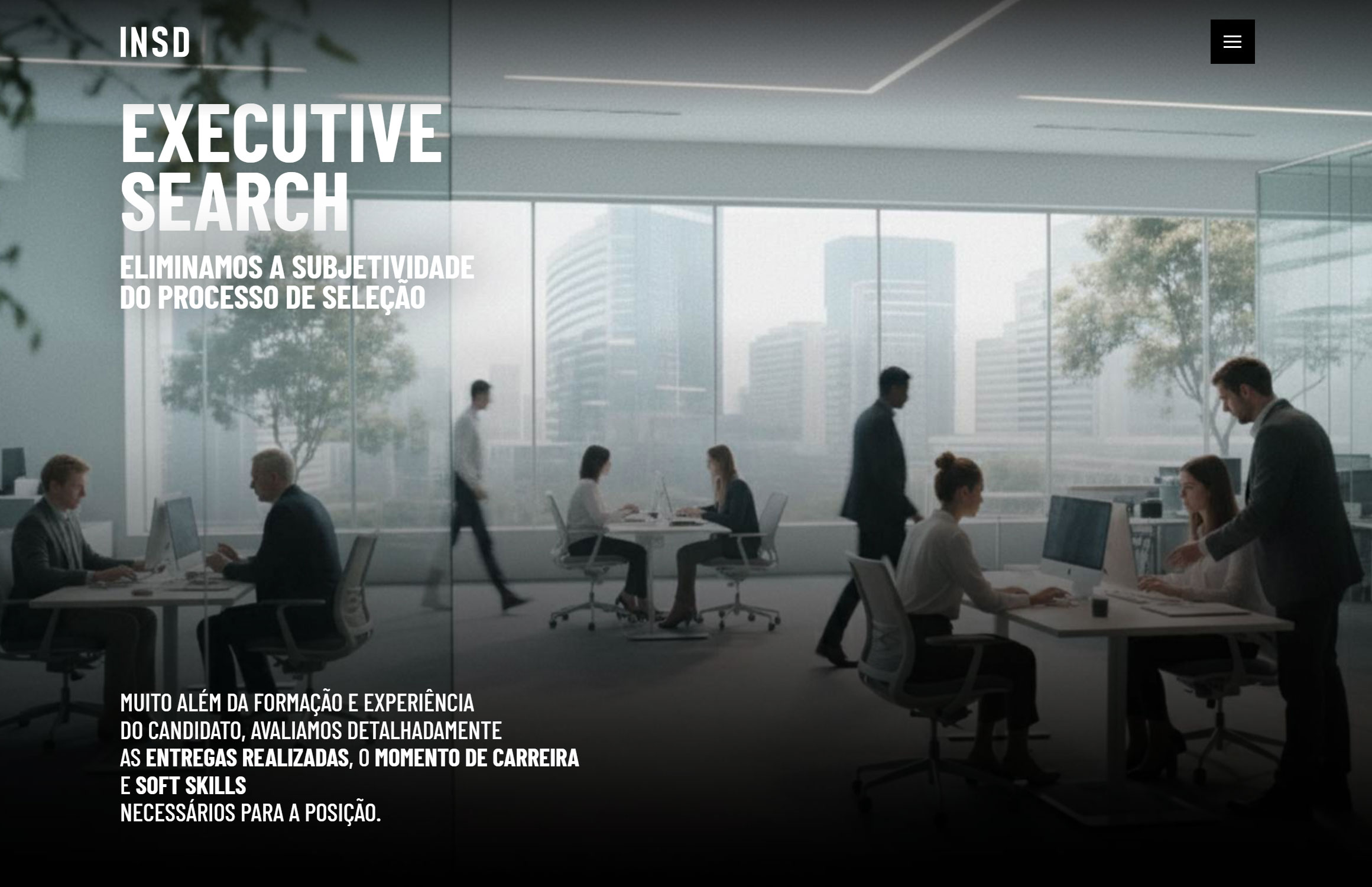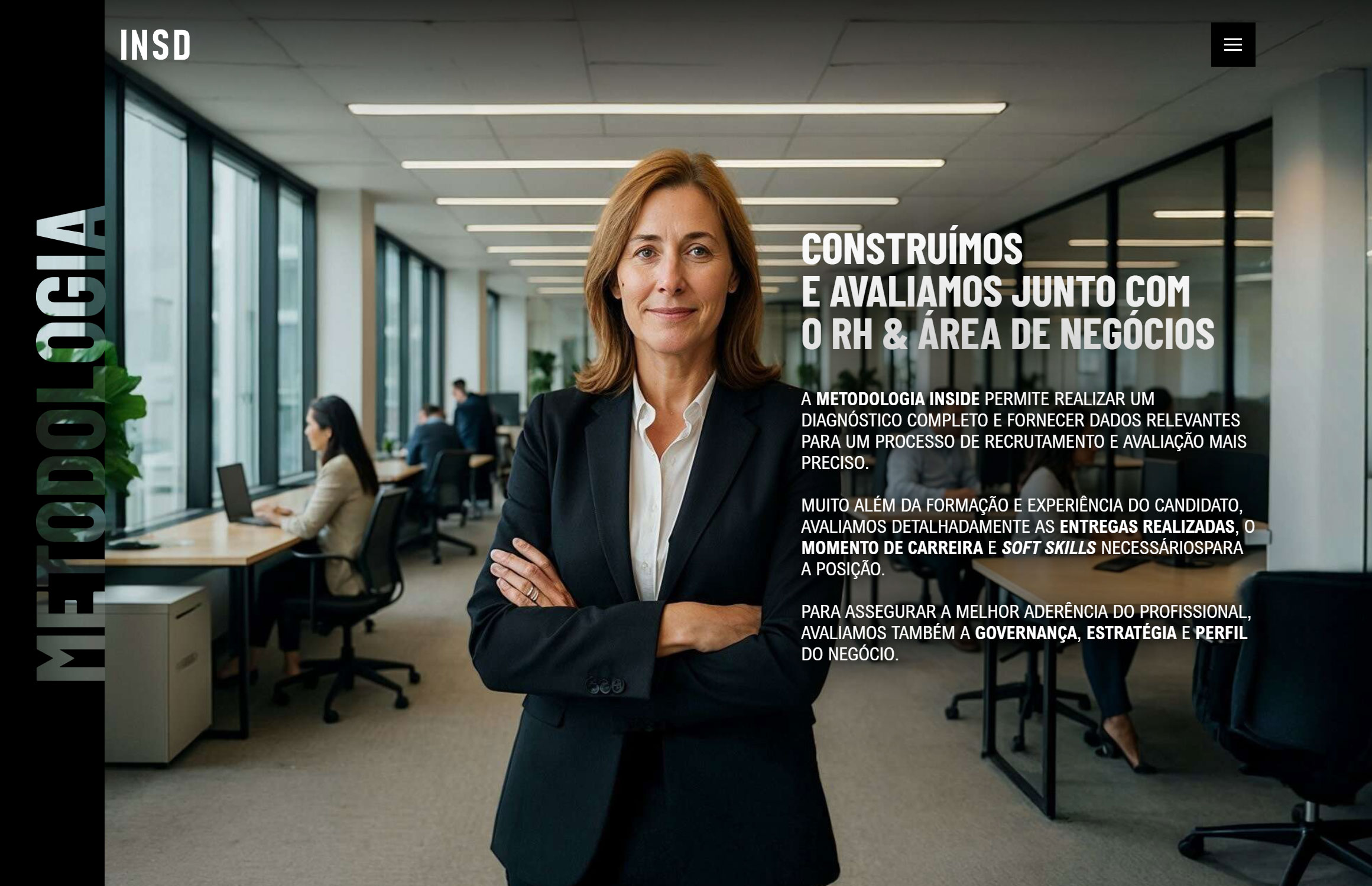 Criamos uma interface estruturada, com foco em clareza e hierarquia de informação, refletindo a própria metodologia da Inside. A navegação foi organizada para destacar suas principais frentes de atuação — executive search, board search, assessment e inteligência de mercado — transformando serviços complexos em uma jornada simples e compreensível. O design reforça precisão, confiança e consistência, alinhado ao perfil do público executivo.