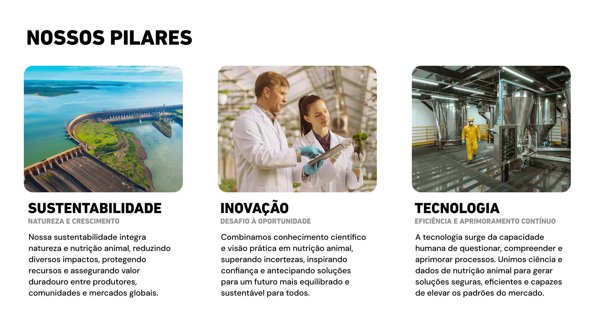 Criamos uma estrutura de navegação orientada por categorias de solução, destacando os principais pilares da empresa: performance, saúde animal e sustentabilidade. O projeto equilibra conteúdo técnico com uma comunicação mais fluida, utilizando hierarquia visual, blocos modulares e storytelling para guiar o usuário.