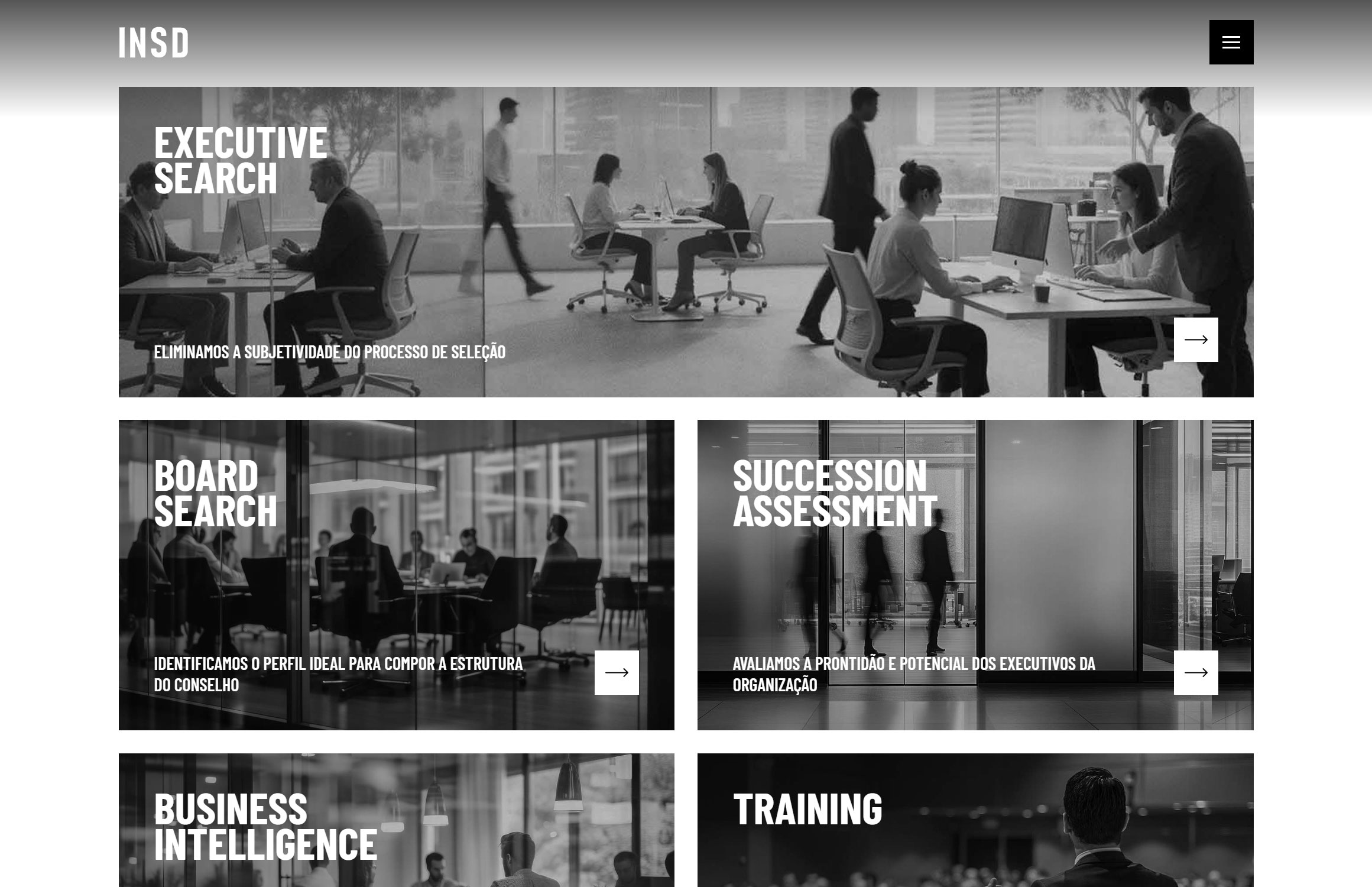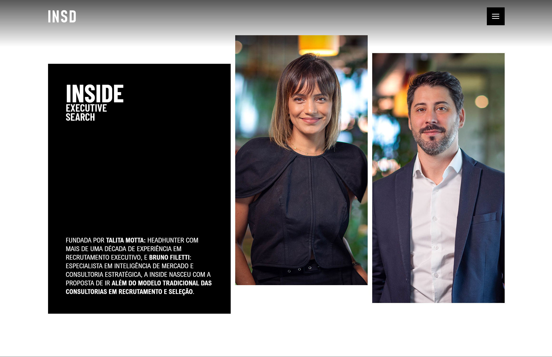 Criamos uma interface estruturada, com foco em clareza e hierarquia de informação, refletindo a própria metodologia da Inside. A navegação foi organizada para destacar suas principais frentes de atuação — executive search, board search, assessment e inteligência de mercado — transformando serviços complexos em uma jornada simples e compreensível. O design reforça precisão, confiança e consistência, alinhado ao perfil do público executivo.